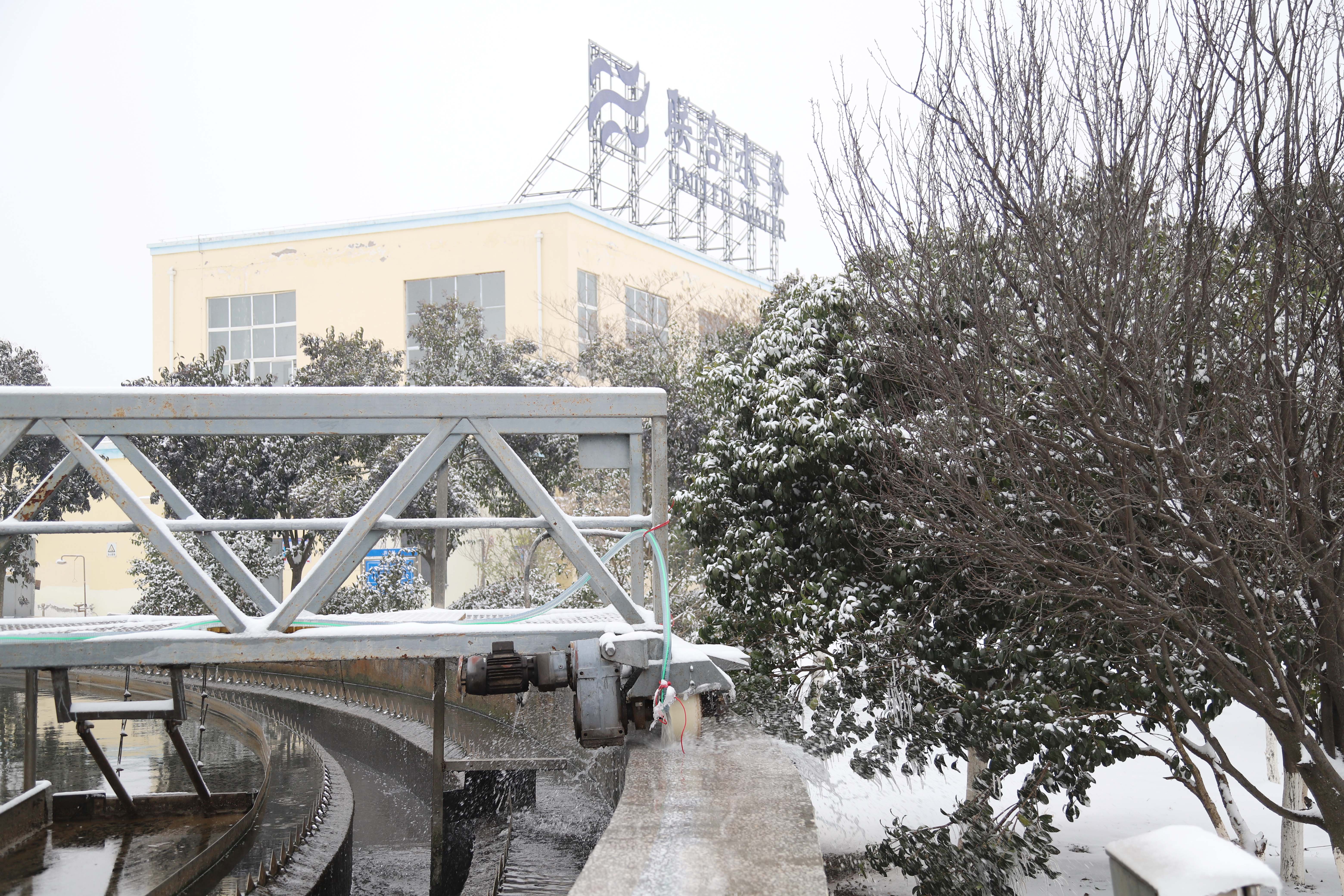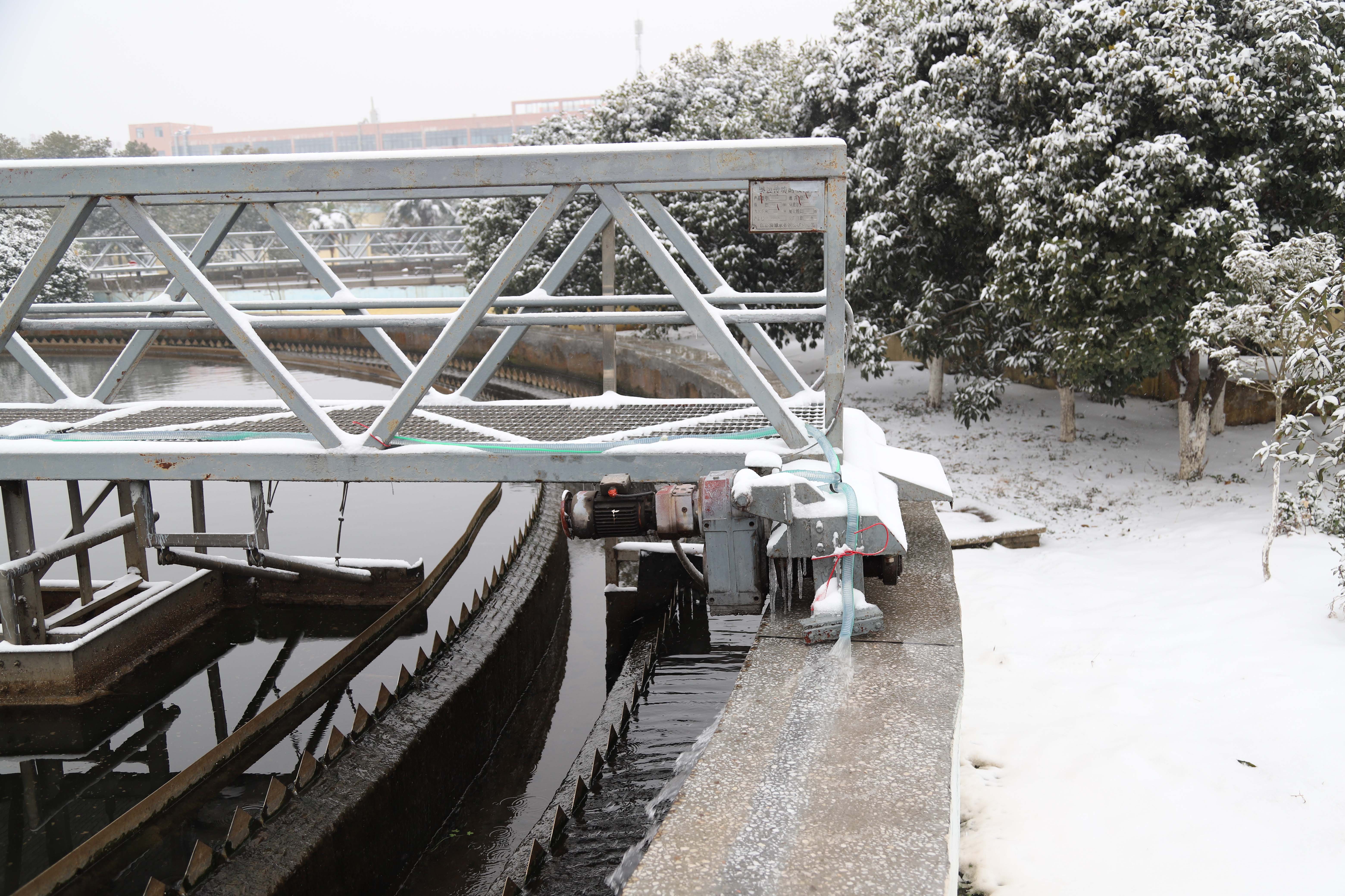 污水處理工作不僅關(guān)系著生態(tài)環(huán)境,也是關(guān)系著千家萬(wàn)戶的民生大事,寒潮天氣下,隨州公司生產(chǎn)人員冒著風(fēng)雪進(jìn)行重點(diǎn)地巡檢,通過(guò)巡檢觀察污水處理廠各工藝單元的感官現(xiàn)象和指標(biāo),初步判斷水質(zhì)的變化和運(yùn)行是否正常、穩(wěn)定,重點(diǎn)設(shè)備是否正常運(yùn)行。在巡檢的過(guò)程中,生產(chǎn)人員發(fā)現(xiàn)一期四座二沉池下方輪子出現(xiàn)打滑空轉(zhuǎn),二沉池運(yùn)轉(zhuǎn)停止的情況。雪落在行走軌道上,被行走輪壓實(shí)后,形成雪層,造成行走輪的打滑,使刮泥機(jī)長(zhǎng)時(shí)間在一個(gè)位置運(yùn)行,池底的污泥無(wú)法全部排出,造成工藝運(yùn)行的異常,需要及時(shí)清理干凈軌道表面的冰層。發(fā)現(xiàn)問(wèn)題后,生產(chǎn)各部門緊急召開臨時(shí)會(huì)議,制定解決方案,最終決定安裝水泵,從池子抽水澆注在軌上道,保障軌道正常運(yùn)行。