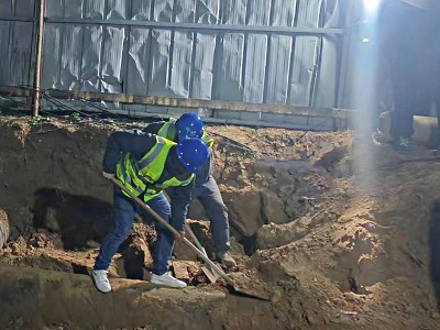 深夜是多數(shù)人夢鄉(xiāng),卻是水務(wù)人的戰(zhàn)場。為了最大程度降低搶修對居民生活用水的影響,搶修工作一般在夜間進行。聯(lián)合水務(wù)宿遷公司搶修團隊以“故障不過夜”的工作作風(fēng),用行動踐行“保障供水安全”的承諾。 “一場搶修背后的聯(lián)合之力” 傍晚臨近下班時分,機電設(shè)備部接到項目部緊急通知,二水廠五期項目現(xiàn)場有電纜疑似破損發(fā)熱,隨時有斷電風(fēng)險。機電設(shè)備部人員經(jīng)現(xiàn)場查看發(fā)現(xiàn),由二水廠一期低壓配電室通往一二期反沖洗泵房配電間主電纜損壞,隨時可能影響一二期生產(chǎn)運行。搶修就是命令,制水部、機電設(shè)備部、項目部快速分工,在保障安全生產(chǎn)的前提下,對破損電纜進行了緊急搶修。搶修人員爭分奪秒,凌晨悄然而至,直到搶修隊伍中有人喊出一聲“回家!”,這場“夜間聯(lián)合作戰(zhàn)”才宣告結(jié)束。