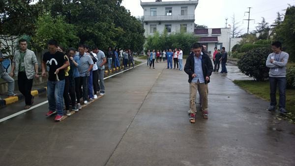 9月30日下午,舉辦的是“無軌列車”活動。該項團體活動要求每組4男4女搭配,各組組員的兩腳必須分站在由兩塊木板制成的行走板上,協(xié)調(diào)一致前行,在比賽過程中任意隊員任意部位與地面有接觸,即被警告1次,同時在總成績上增加10秒,警告3次取消比賽資格。賽道全長50米,含下坡路段,成績匯總后,以完成比賽用時最短的一組獲勝。最終,行政財務(wù)聯(lián)隊以1分48秒的成績獲得第一,工程聯(lián)隊獲得第二,洋河聯(lián)隊、污水客服聯(lián)隊并列第三。